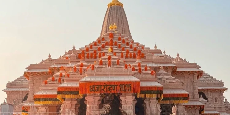 PM Modi and Mohan Bhagwat performed puja at Ram Darbar, carrying a robe and a fan for Ram Lalla; will hoist the flag shortly : इसके बाद, दोपहर लगभग 12:00 बजे प्रधानमंत्री ध्वजारोहण कार्यक्रम में भाग लेंगे, जो राम मंदिर निर्माण की औपचारिक पूर्णता का प्रतीक होगा। यह समारोह देशभर के भक्तों के लिए गहरी सांस्कृतिक और आध्यात्मिक महत्व रखता है। अभिजीत मुहूर्त में पीएम के बटन दबाते ही 2 किलो की केसरिया ध्वजा 161 फीट ऊंचे शिखर पर फहरने लगेगी। इसके साथ ही राम मंदिर को पूर्ण माना जाएगा।