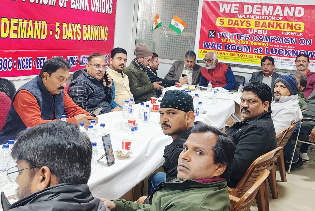 लखनऊ(BNE) पांच दिवसीय बैंकिंग प्रणाली को लागू करने की मांग को लेकर आज बैंककर्मियों ने अवध ट्रेड सेंटर, लालबाग पर वार रूम का गठन कर “ट्विटर अभियान” चलाया।