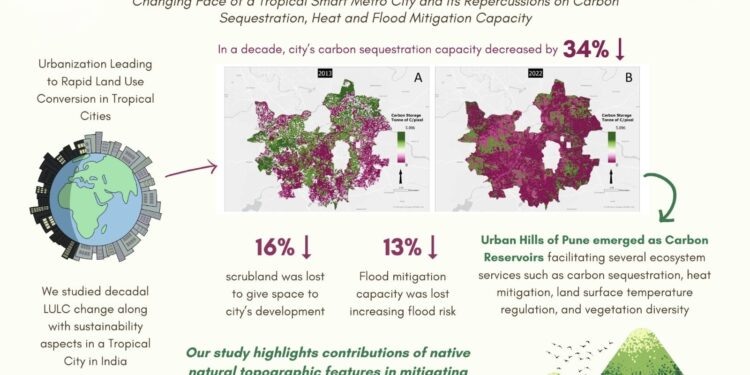 : पुणे ने बीते दस सालों में अपनी कार्बन सीक्वेस्ट्रेशन क्षमता में 34 प्रतिशत की गिरावट दर्ज की है, जो मुख्य रूप से तेज़ी से शहरी विकास की वजह से हुआ है। हाल ही में एमआईटी-वर्ल्ड पीस यूनिवर्सिटी के डॉ. पंकज कोपार्डे तथा सस्टेना ग्रीन्स एलएलपी की प्रतीक्षा चालके द्वारा साथ मिलकर की गई एक स्टडी के नतीजे में शहर की कार्बन डाइऑक्साइड (CO₂) नामक एक प्रमुख ग्रीनहाउस गैस को सोखने की क्षमता में इतनी बड़ी गिरावट की बात सामने आई है। “लूजिंग द कार्बन गेम? चेंजिंग फेस ऑफ ए ट्रॉपिकल स्मार्ट मेट्रो सिटी एंड इट्स रेपरकशंस ऑन कार्बन सीक्वेस्ट्रेशन, हीट एंड फ्लड मिटिगेशन कैपेसिटी” नाम से यह रिसर्च सस्टेनेबल फ्यूचर्स जर्नल में प्रकाशित की गई थी।