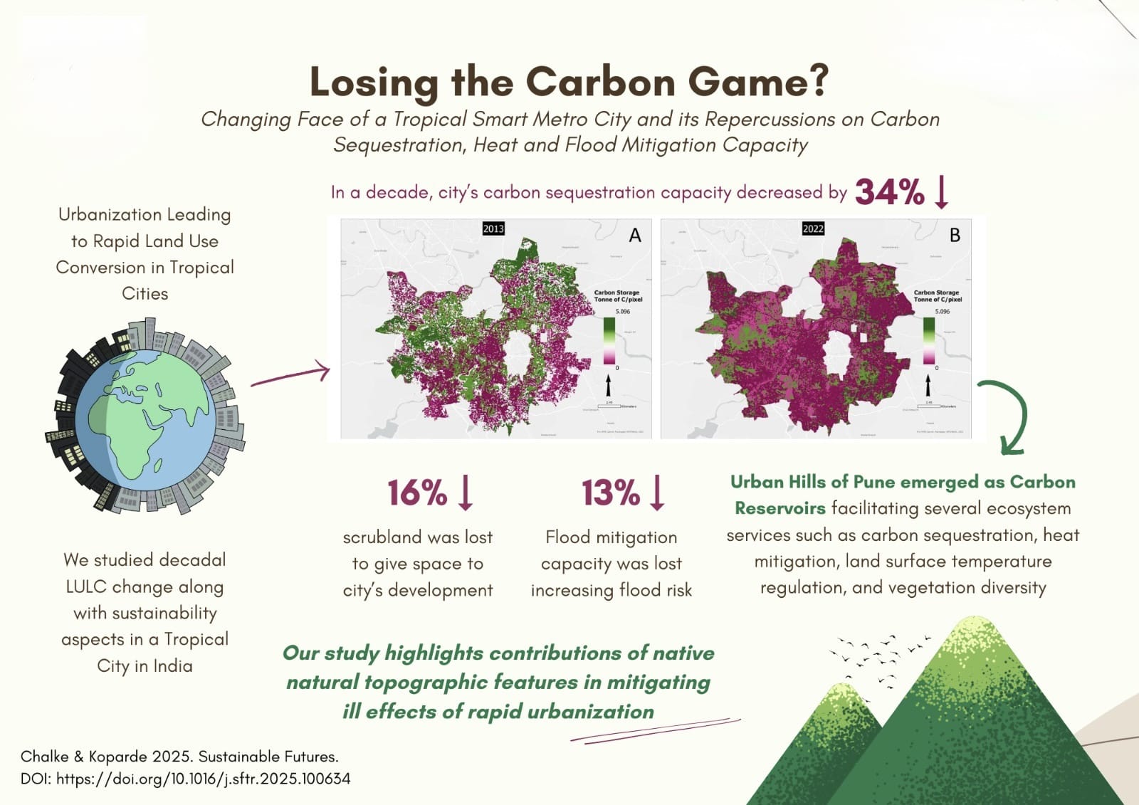 यह स्टडी पुणे के कुदरती इलाकों, यानी यहां की पहाड़ियों, नदियों और वेटलैंड्स को बचाए रखने की अहमियत उजागर करती है, जो पारंपरिक रूप से कार्बन एमिशन, गर्मी और बाढ़ को कम करने वाले कुदरती सुरक्षा कवच की तरह काम करते रहे हैं।