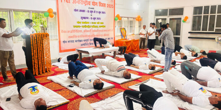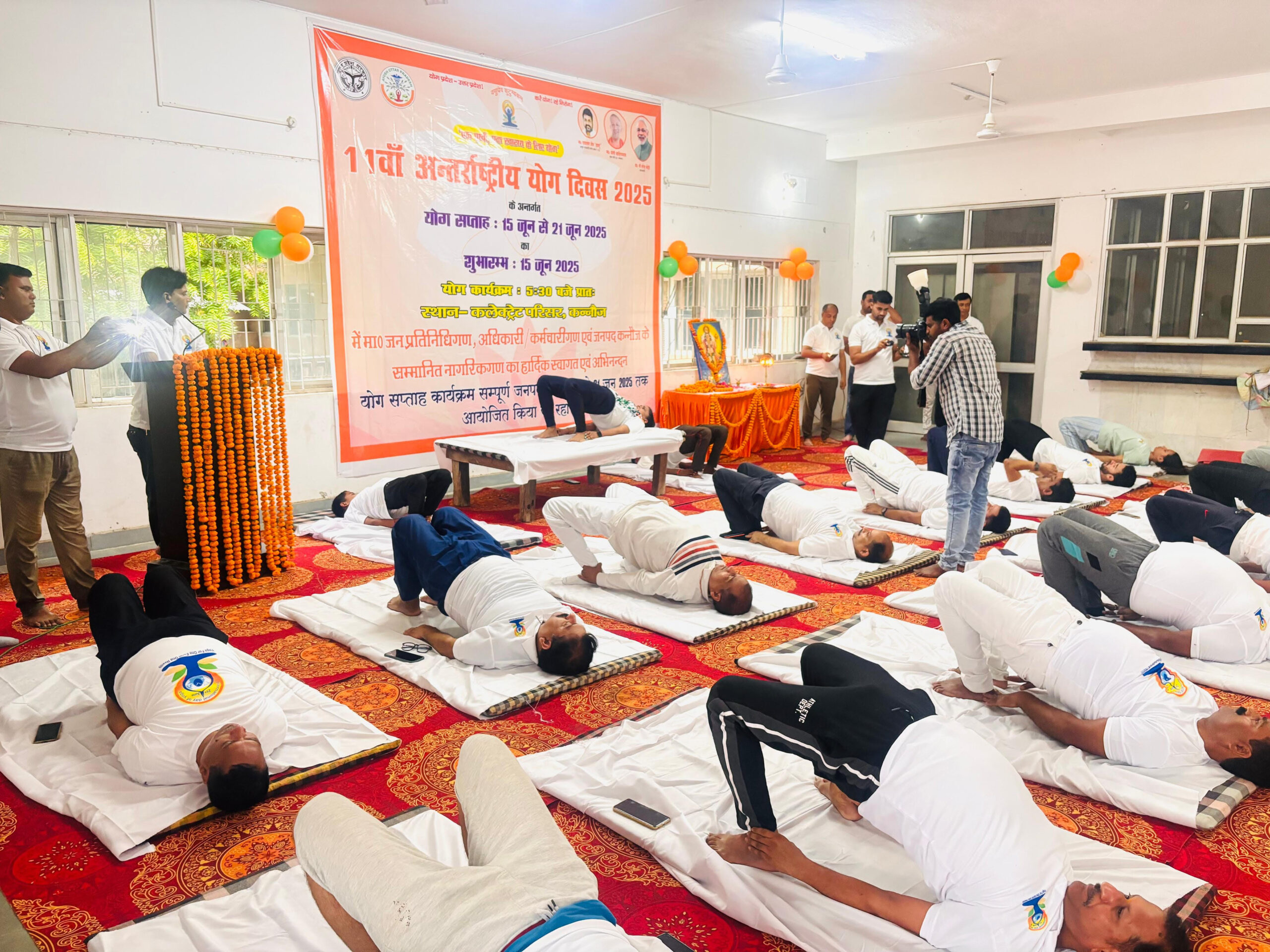कन्नौज: जिलाधिकारी आशुतोष मोहन अग्निहोत्री व पुलिस अधीक्षक विनोद कुमार एवं मुख्य विकास अधिकारी राम कृपाल चौधरी तथा अपर जिलाधिकारी (वि0/रा0) आशीष कुमार सिंह, अपर जिलाधिकारी (न्यायिक)  देवेन्द्र सिंह आदि अधिकारी व कर्मचारियों द्वारा संयुक्त रूप से 11वां अंतर्राष्ट्रीय योग दिवस के अंतर्गत (15 जून 2025 से 21 जून 2025 तक) आयोजित होने वाले योग सप्ताह के तहत कलेक्ट्रेट परिसर हॉल में योगाभ्यास किया। इस अवसर पर जिलाधिकारी ने दीप प्रज्ज्वालित कर योग सप्ताह कार्यक्रम का शुभारम्भ किया।