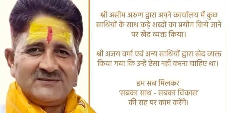 हंगामे में शामिल भाजपा जिला मंत्री अजय वर्मा से स्पष्टीकरण मांगा गया। जिलाध्यक्ष वीरसिंह भदौरिया की मध्यस्थता में दोनों पक्षों के बीच बातचीत हुई। मंत्री असीम अरुण ने कार्यकर्ताओं के प्रति अपने रवैये पर और जिला मंत्री अजय वर्मा ने भी खुले विरोध के लिए खेद जताया। इस तरह दोनों पक्षों के बीच सुलह हो गई।