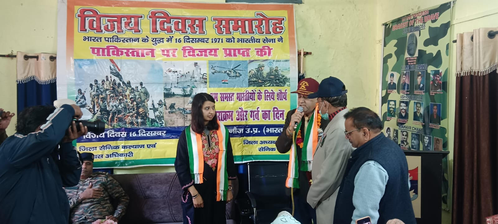 कन्नौज। आज जिला सैनिक कल्याण एवं पुर्नवास कार्यालय प्रांगण मे 1971 के युद्व मे पाकिस्तान पर मिली जीत की 54वीं वर्षगाॅठ के अवसर पर विजय दिवस समारोह का आयोजन किया गया। सबसे पहले कर्नल रोहित भटारा द्वारा झण्डा रोहण किया गया। तत्पश्चात राष्ट्रगान उसके बाद युद्व मे शहीद हुए सैनिको के प्रति दो मिनट का मौन रखा गया। उपजिलाधिकारी सदर सुश्री वैशाली द्वारा द्वीप प्रज्जवलित कर व शहीदों के चित्रो पर पुष्पांजलि अर्पित कर वीर नारी हंसमुखी देवी पत्नी शहीद सिपाही कृष्ण मुरारी और उमा देवी पत्नी शहीद सिपाही रोहण सिंह, शान्ती देवी पत्नी शहीद सिपाही हंसराम के साथ 05 बैटल कैजुयल्टी और युद्व मे भाग लेने वाले पूर्व सैनिक देवकी नन्दन  का माल्यार्पण एवं शाल ओढाकर सम्मानित किया गया।