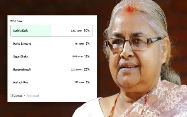 रिपोर्ट के मुताबिक, केपी शर्मा ओली के इस्तीफे के बाद नेपाल के ‘जेनरेशन-जेड’ (Gen-Z) नेताओं ने गेमिंग प्लेटफॉर्म डिस्कॉर्ड पर एक सर्वे कराया। इसमें सुशीला कार्की के अलावा धरान के मेयर हड़का सम्पाग और महावीर पुन जैसे नाम भी शामिल थे। इस सर्वे में कुल 7713 वोट पड़े, जिसमें से लगभग 50% यानी 3833 वोट कार्की के पक्ष में आए। इसी सर्वे को आधार बनाकर जेन-जेड के प्रतिनिधियों ने राष्ट्रपति रामचंद्र पौडेल से संपर्क किया, जिसके बाद कार्की की नियुक्ति अंतरिम प्रधानमंत्री के पद पर कर दी गई।