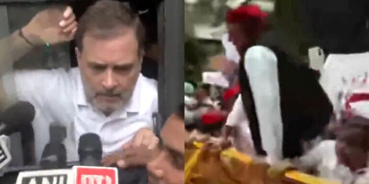 अब विरोध में विपक्षी सांसद दिल्ली की सड़कों पर बैठे हैं। इस बीच, समाजवादी पार्टी के प्रमुख अखिलेश यादव पुलिस बैरिकेड लांघकर कूद गए, जब दिल्ली पुलिस ने संसद से चुनाव आयोग तक मार्च कर रहे INDIA गुट के नेताओं को रोका।